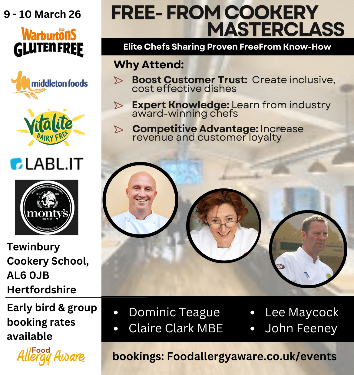 9-10 March | Tewinbury Cookery school, Hertfordshire AL6 0JB | https://foodallergyaware.co.uk/events/free-from-cookery-masterclass/