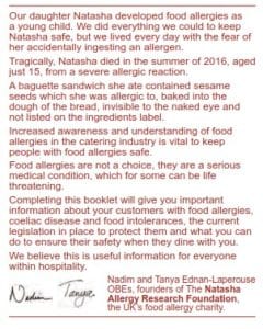 This booklet is dedicated to the memory of Cameron Wahid, who tragically passed away in 2015; Natasha Ednan‑Laperouse, who died in 2016 and Owen Carey, who lost his life in 2017 from anaphylactic reactions. Their stories have had a profound impact, driving greater awareness and action around food allergies and allergen safety. Their legacies continue to inspire vital improvements in food safety legislation, allergen labelling, and staff training. We hope this booklet serves as a valuable tool for the food service industry, helping to create safer dining environments and preventing future tragedies. More information: https://www.narf.org.uk | https://owens-law.co.uk